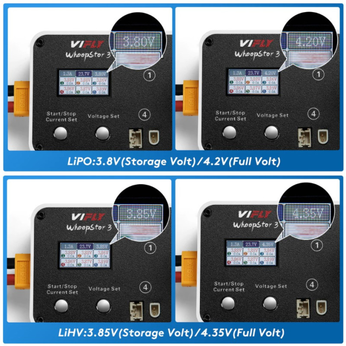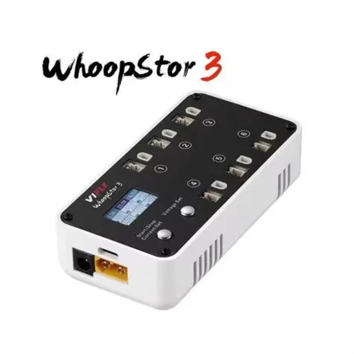 VIFLY WhoopStor 3 — це універсальна розумна зарядна станція для FPV-акумуляторів, що поєднує функції зарядки, балансування та зберігання (storage mode). Підтримує батареї від 1S до 6S, має чіткий дисплей, автоматичне балансування та захист від перезаряду. Ідеально підходить для мікро-дронів, хтоупів, 5" FPV та будь-яких LiPo/LiHV-паків.
